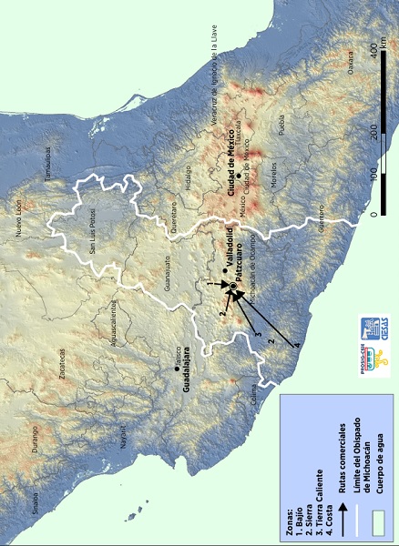La ciudad contaba con uno de los índices poblacionales más altos, ya que había aproximadamente 3 286 habitantes para mediados de siglo; estaba constituida por diferentes grupos sociales, mulatos y mestizos en su mayoría, seguidos en número por españoles, indígenas y negros, en menor cantidad (López, 1965; González, 1985; Casorla, 2019).3 En el ámbito económico, el movimiento comercial se incrementó, puesto que Pátzcuaro fungía como un importante punto de intercambio comercial debido a su ubicación geográfica estratégica, que enlazaba el Bajío, la Tierra Caliente y la Costa, así como la Sierra y la ciudad de Valladolid. Esta situación convirtió a la ciudad en un centro de abastecimiento y de acopio de mano de obra, así como en un destino económico y políticamente atractivo para muchos comerciantes, en su mayoría peninsulares (Silva, 1991; Enkerlin, 1998).