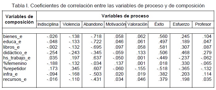 En primer lugar se exploran las relaciones de las variables de composición escolar (Ce) y de proceso escolar (Pe) a través del coeficiente de correlación (Tabla I). Algunas variables de Pe mantienen alta correlación con casi todas las mediciones de Ce. Este es el caso de éxito y abandono. En general, entonces, las escuelas de más alto nivel socioeconómico, de menor proporción de repetidores y de más recursos institucionales disponibles, suelen tener una alta expectativa de éxito futuro debido a la escuela y menores niveles (percibidos) de abandono escolar. Aunque menos intensamente, esfuerzo se comporta de la misma manera. El efecto de la composición de género es particular: no se relaciona con éxito y abandono, pero sí con esfuerzo; o sea, cuanto mayor es el porcentaje de mujeres en la escuela, mayor es el cumplimiento promedio de tareas. Las actitudes frente a las matemáticas (conocimiento escolar) son las que menos se asocian a las variables de Ce. Este comportamiento se ajusta a la hipótesis de que estas variables actitudinales expresan, en gran medida, el efecto de la acción escolar. También es interesante observar que no existe covariación importante entre la percepción del nivel de indisciplina y las variables de Ce. La percepción del umbral de violencia muestra un ajuste mayor con la Ce, pero muy inferior al desplegado por abandono. Si se adoptase la hipótesis, bastante común, de que el nivel objetivo de indisciplina aumenta a medida que disminuye el nivel socioeconómico del estudiantado, entonces, el comportamiento de indisciplina sugiere que el sentido de disciplina para el estudiante cambia según la composición social. Por ello, la baja asociación entre el nivel de indisciplina y la Ce registrada también por la literatura internacional (Stringfield, 1994). La percepción del estudiante sobre la eficacia de la práctica pedagógica y su relación con los docentes -profesor- tampoco se asocia significativamente con la Ce. Cabe preguntarse si la hipótesis de cambio de sentido también es aplicable a esta variable.