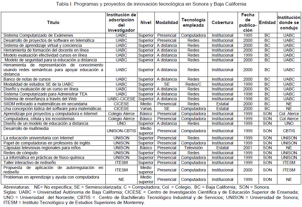 Como se puede apreciar en la Tabla I, se detectaron 26 trabajos sobre innovaciones que reunían los requisitos para ser incluidos en el estado del conocimiento.8 Del total, 21 fueron elaborados por académicos adscritos a instituciones públicas y los restantes a instituciones privadas o no especificadas; 18 se realizaron en instituciones de educación superior, 3 en nivel medio superior, 1 en nivel medio, 3 en básico y una en diversos niveles. La tecnología educativa más socorrida fue la computadora (25 trabajos) y solamente un trabajo de televisión. La cobertura de los trabajos fue esencialmente institucional (23 trabajos) o estatal (3 trabajos). La mayoría de los trabajos se publicó después de 1999. En cuanto a entidades, los trabajos detectados se reparten casi equitativamente entre Baja California (14 trabajos) y Sonora (12 trabajos). No se localizó trabajo alguno en Baja California Sur. Finalmente, en lo que corresponde a instituciones destacan dos: la Universidad Autónoma de Baja California (UABC), con 12 trabajos, y la Universidad de Sonora (UNISON) con 6.
