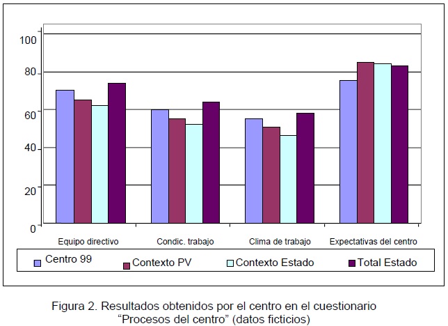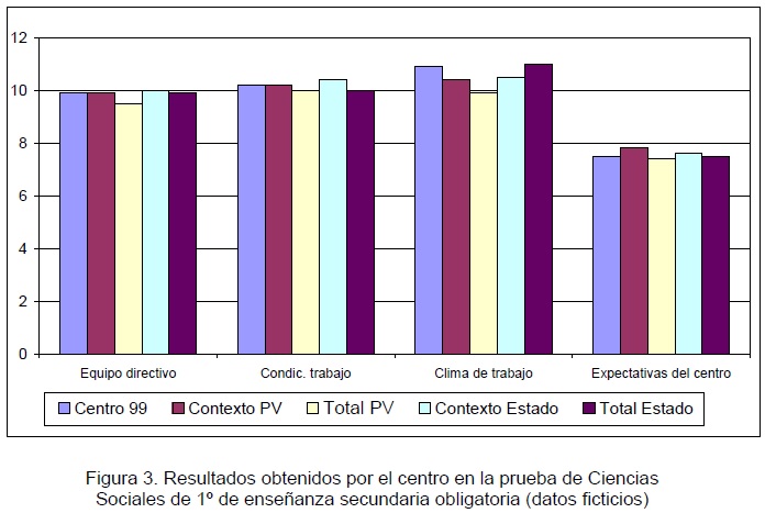 A continuación se presentan ejemplos de dos gráficos que aparecen en los informes (ver Figuras 2 y 3). El primero muestra resultados obtenidos en el cuestionario "Procesos del centro" cumplimentado por el profesorado, comparado con los resultados de los centros de su mismo contexto y con los de la totalidad de los centros, tanto del País Vasco (PV) como del Estado Español.