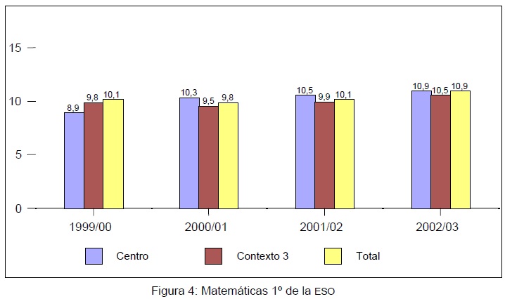 Fernández Díaz y González Galán (1997) señalan las características de los procesos de escuelas eficaces que bien pueden ser asumidas por el modelo de evaluación REDES. En este tipo de evaluación se considera que los procesos de mejora no terminan con la puesta en marcha de la renovación escolar, al contrario, no tienen fin, son procesos continuos que implican ajustes sucesivos para cundir un objetivo de mejora permanente, en constante revisión y, si se da el caso, con nuevos objetivos a alcanzar. Los resultados no suelen ser inmediatos y si lo fueran habría que evaluar la estabilidad del cambio; por ello, muchos autores abogan por estudios longitudinales a través de varios años (entre tres y cinco) para que los resultados obtenidos, tanto positivos como negativos, tengan cierta consistencia y estabilidad. El modelo de evaluación REDES es un proceso que abarca cuatro años de manera longitudinal. Ello permitirá ofrecer información a los centros acerca de su propia evolución, a través de una comparación de su avance entre un año y otro. Así por ejemplo, en el caso del alumnado que en el curso 1999-2000 se encontraba en 1° de educación secundaria, va a ser posible darle seguimiento total a toda su escolarización en dicho nivel educativo, ya que se conocerán sus puntuaciones al comienzo de 1° (nivel inicial), al final de 2° (nivel final/principio de ciclo) y al final de 4° (nivel final de la educación secundaria). De esta forma, nos estaríamos acercando al concepto de valor añadido, dado que permite comparar el rendimiento esperado de los alumnos con el rendimiento observado y, posteriormente, analizar las discrepancias. A este valor añadido Goldstein y Spiegelhalter (1996) prefieren llamarle "comparaciones ajustadas" (adjusted comparisons), debido a la influencia que ejerce el contexto en el rendimiento de los alumnos. En las figuras 3, 4, 5 y 6 puede verse de manera gráfica lo que acabamos de señalar, con el caso de un centro en concreto.