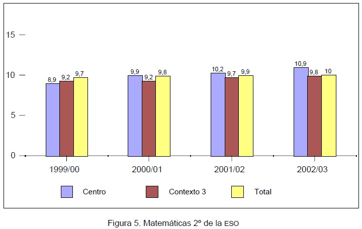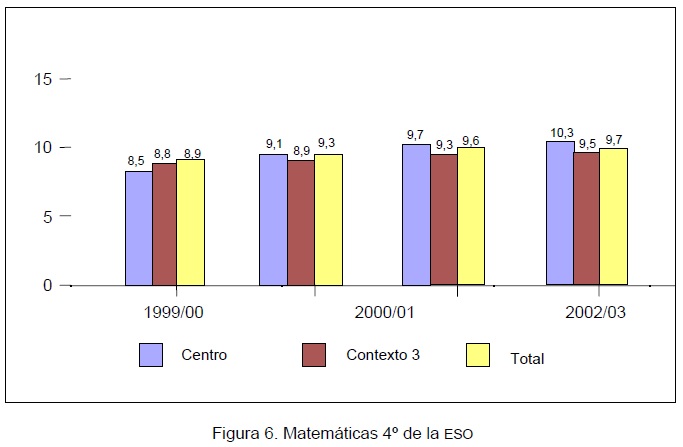 • Polígono de frecuencias en el que de forma gráfica y numérica se reflejan las puntuaciones medias del centro escolar específico, de los centros del mismo contexto sociocultural dentro de la comunidad autónoma, del total de los de la comunidad, de los centros del mismo contexto sociocultural dentro del Estado Español y del total que participan en la evaluación dentro del Estado.