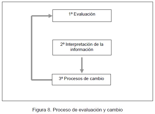 Ahora bien, este primer paso no es el último. Para que la evaluación contribuya a generar procesos de cambio y mejora es necesario que demos al menos otros dos pasos. El segundo es interpretar y utilizar de forma adecuada la información obtenida. El tercero consiste en promover proyectos o iniciativas de cambio. Un último paso que cierra el círculo es volver a evaluarse para comprobar la dinámica que se está produciendo (ver Figura 8).