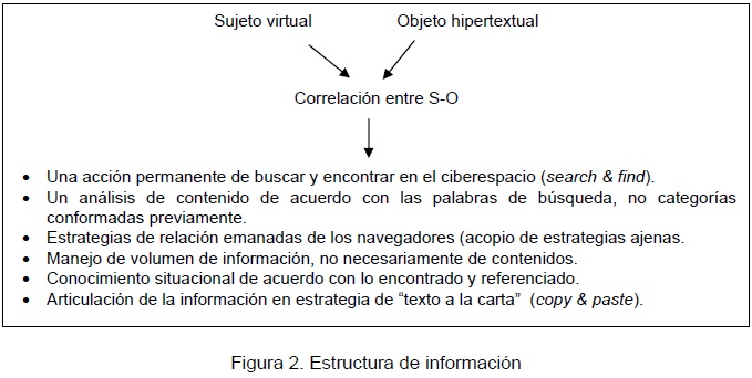 This article presents a reflection on the virtual subject inside the theory of knowledge and the challenges of the information poured in the hiper-text. The discussion is nourished around the need or shortage of a structure of knowledge set against a structure of information that, at the same time, confronts our academic tasks and reconfigures our strategies to transmit knowledge. This exercise was made from a direct non-participant observation of Internet users in auto-access public and institutional centers. The studied population was a group of students in out of school activity who were using Internet searching for topics related to "research", "tasks" or only "to know more" about something.