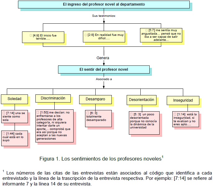 La situación psicológica en la que se encuentran los profesores noveles del departamento se asemeja a la que refiere Saint-Onge (1997), en cuanto a que, comúnmente, el docente novel vive un período de angustia e inseguridad y, por lo general, su labor de enseñante generalmente se limita sólo al aula, construyendo una práctica pedagógica solitaria. Los estados psicológicos generados por el aislamiento, la falta de apoyo y el rechazo de los profesores, pueden generar malestar docente, causar lo que Santos Guerra (1983) denomina la erosión de la función docente, que significa el deterioro de las ilusiones, esperanzas, esfuerzos y compromisos (citado en Marcelo, 1994, p. 153).