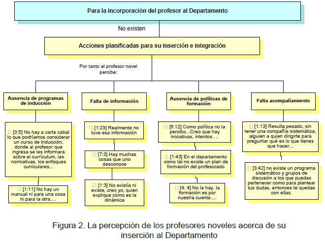 Los docentes perciben que en el período de inserción no son atendidos de manera sistemática ni institucionalizada, por cuanto no participan en actividades planificadas para tal fin. En ese sentido, expresan que no existen programas de inducción, no se les proporciona suficiente información sobre los aspectos administrativos y curriculares que deben atender; asimismo, consideran que no existe una apropiada política de formación del personal que ingresa, ya que no se acompaña al profesor que ingresa en el reconocimiento e incorporación a la institución. La adaptación del profesor novel se deja únicamente a la iniciativa e interés de éste (ver Figura 2).