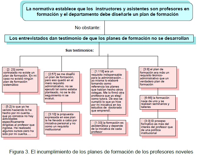 El artículo 58 del Estatuto del Personal Docente y de Investigación de la Universidad de Los Andes (1990) establece que el personal docente y de investigación en los dos primeros niveles del escalafón (instructor y asistente) deben someterse a programas de formación y mejoramiento establecidos por la Universidad y deben ser considerados como profesores en proceso de formación; por tanto, el departamento como unidad académico-administrativa que los acoge, debe diseñarles un plan de formación y designarles un tutor. No se encontraron documentos que establecieran las características, los alcances o las especificaciones para el diseño de ese plan; sin embargo, a partir de la propia experiencia de las autoras de este trabajo y de lo que informan los entrevistados, se conoce que dicho plan se elabora de prisa y bajo la presión de una exigencia administrativa, para satisfacer uno de los requisitos que implica la incorporación del profesor a la universidad en condición de ordinario, después de haber obtenido el cargo por concurso de oposición. Es de señalar que esta normativa no considera la situación de los profesores contratados y no contempla su inclusión en los planes de formación, probablemente al asumir que no deben permanecer más de un año en esta condición. La realidad que se encontró en el departamento de Pedagogía es que existen profesores contratados en la categoría de instructor con más de un año en tal situación.
