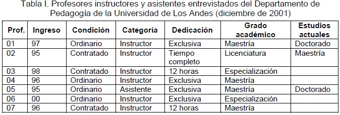 Se seleccionaron todos los profesores del departamento de Pedagogía ubicados en las categorías de instructor y asistente, fueran ordinarios o contratados, de los cuales se entrevistaron siete.