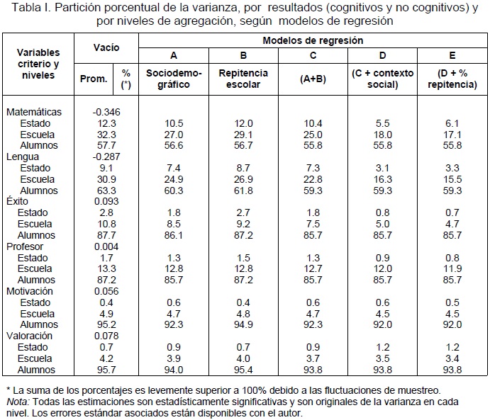 Todas las variaciones interescuela son estadísticamente significativas. Las escuelas difieren entre sí respecto a los resultados que obtienen sus estudiantes, sean cognitivos o no cognitivos. Sin embargo, es sobre los primeros que la institución educativa está más asociada -alrededor del tercio de la variación total de ambos rendimientos-. En cambio, esa variación es de 11 a 13% cuando se trata de la expectativa de éxito futuro o de las relaciones alumno-profesor y menor a 5% en el caso de la motivación y la valoración de las Matemáticas. Por otra parte, sólo los logros cognitivos difieren significativamente entre Estados y, como consecuencia, las variaciones "entre-estudiante" (intraescuela) de los no cognitivos alcanzan valores muy superiores a los observados en los cognitivos. En términos generales, esta distribución es razonable ya que los resultados cognitivos le deben más a la escuela que los no cognitivos, vinculados más estrechamente con el origen y contexto familiar.