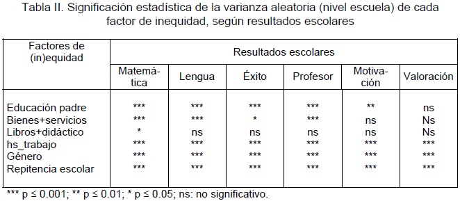 En los modelos anteriores se suponía que la intensidad de la asociación entre la variable-criterio y cada uno de los factores individuales era similar en todas las escuelas; sin embargo, puede variar. Para evaluar esta posibilidad se debe permitir que tal correlación varíe a nivel escuela (aleatorización). Con la finalidad de simplificar el análisis, se modeliza solamente la varianza de cada efecto, manteniendo fijas las covarianzas de los diversos efectos entre sí y de éstos con el rendimiento promedio de la escuela (intercepto). El objetivo es saber si la fuerza de la incidencia de esos factores varía entre las escuelas. En la Tabla II se indica la significación estadística de la varianza (nivel 2) de cada factor para cada variable-criterio.7