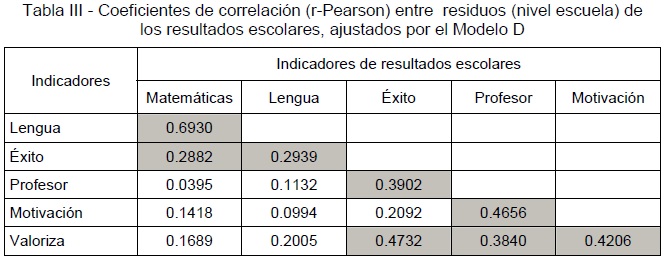 1. Consistencia por resultados escolares. Se trata de conocer si las escuelas son igualmente efectivas respecto de los resultados cognitivos y no cognitivos (Tabla III). La mayor consistencia se registra entre los resultados académicos; sin embargo, el coeficiente estimado (=0.69) indica que, en gran medida, la eficacia escolar varía según el área curricular considerada. Las escuelas con mayor efecto sobre el logro en Matemáticas no son necesariamente las que tienen el mayor efecto sobre el logro en Lengua. Por otro lado, el rango de las correlaciones entre los resultados no cognitivos es de 0.38 a 0.47, correlaciones cercanas entre sí, pero aún más bajas que la anterior. Finalmente, las correlaciones entre resultados cognitivos y no cognitivos son notoriamente bajas (en un rango de 0.04 a 0.29), e indican alta inconsistencia de efectividad escolar respecto de estos dos tipos de resultados.
