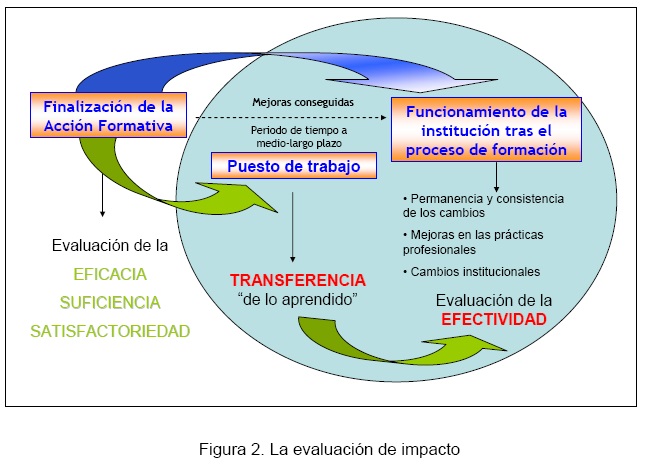 En la mayoría de los casos, la evaluación de la formación se dirige a la satisfacción de los participantes y al logro de los objetivos de la misma, aspectos importantes, pero no los únicos. Lo esencial de la evaluación de impacto nos remite a la actuación personal, profesional e institucional de los participantes de la formación en contextos específicos, fuera ya del programa desarrollado. Es en este contexto de actuación, donde hay que hacer hincapié en la verificación de la satisfacción de necesidades, si hay transferencia de lo aprendido, y si se producen cambios significativos en la actuación personal y profesional de los destinatarios de la formación y los no destinatarios de la misma.