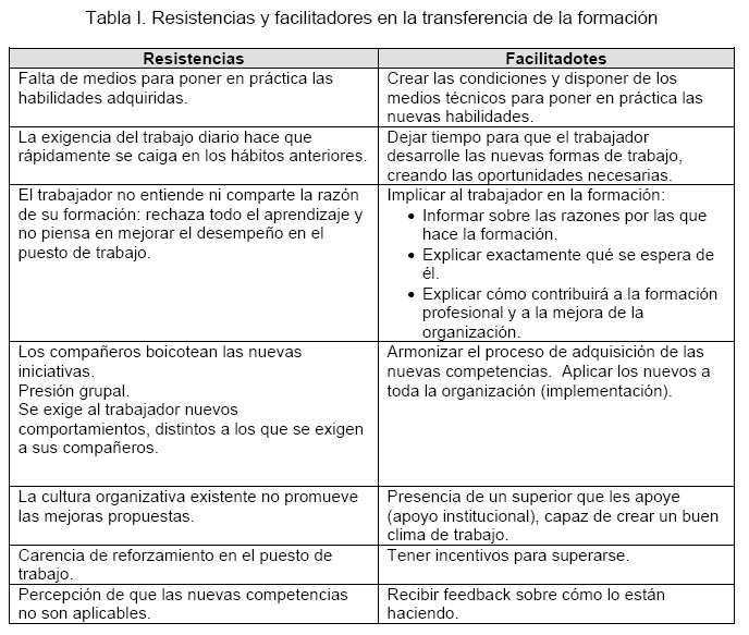 En la Tabla I se muestran algunas de las resistencias que pueden surgir en el momento de aplicar los conocimientos y habilidades adquiridas al puesto de trabajo (Ferrández Lafuente, 2006).