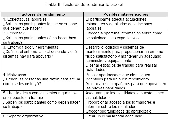 La bibliografía sobre rendimiento laboral describe varios factores que sostienen las buenas actuaciones en el puesto de trabajo (Sullivan, 2002). En la Tabla II se muestran los más destacados.