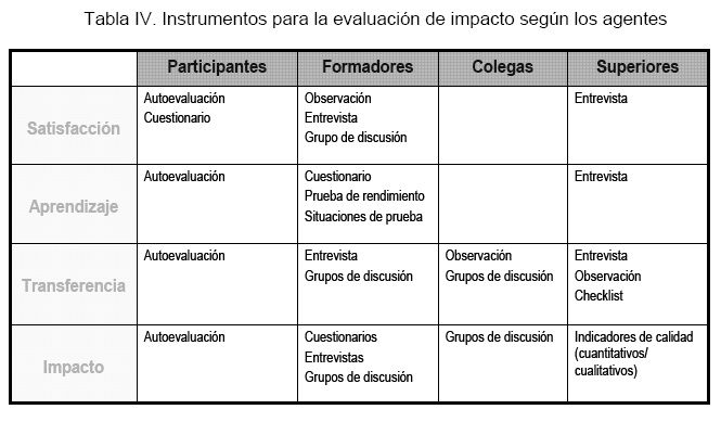 Cuando la adquisición de conocimientos y habilidades se identifica como una solución para un problema en el rendimiento laboral, la formación o cualquier otra situación de aprendizaje, será utilizada para mejorar el rendimiento de los trabajadores. Para realizar óptimamente este proceso es necesario implicar a toda la organización, para conocer los efectos reales producidos. Así, en la evaluación de impacto se implican alumnos-trabajadores, formadores-expertos externos, mandos superiores y mandos intermedios-colegas. Estos agentes tienen responsabilidades antes, durante y después de la formación. En las tablas que se muestran a continuación, se especifican las funciones e instrumentos de evaluación en cada uno de los niveles de impacto, según los agentes implicados.