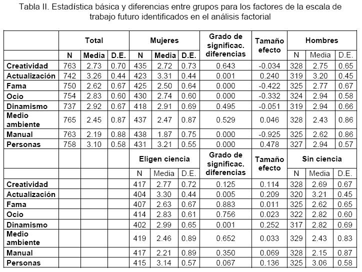 Las diferencias estadísticamente significativas entre los grupos de elección de ciencias para los factores del trabajo futuro también son escasas, y siguen el patrón inverso a las diferencias de género. Los factores actualización y medio ambiente exhiben diferencias estadísticamente significativas entre alumnos que eligieron una asignatura de ciencias y quienes no lo hicieron. Los estudiantes de ciencias exhiben en esos factores puntuaciones significativamente superiores a los demás, aunque en los dos casos el tamaño del efecto es pequeño. Así pues, los estudiantes que eligen ciencias en el último curso de la eso se diferencian significativamente de sus contrapartes en que conceden más importancia a los aspectos de autoactualización y medio ambiente en el trabajo.