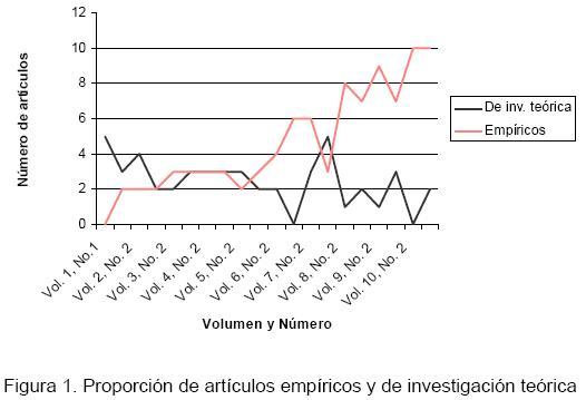 La REDIE se ha caracterizado como una publicación que no está ceñida a una temática específica en educación, pero sí se orienta a presentar la actualidad en investigación. En un principio predominaron los artículos que reportan avances de investigación de tipo teórico; sin embargo, a partir del sexto volumen la proporción de éstos respecto a los artículos de corte empírico cambió (ver Figura 1).