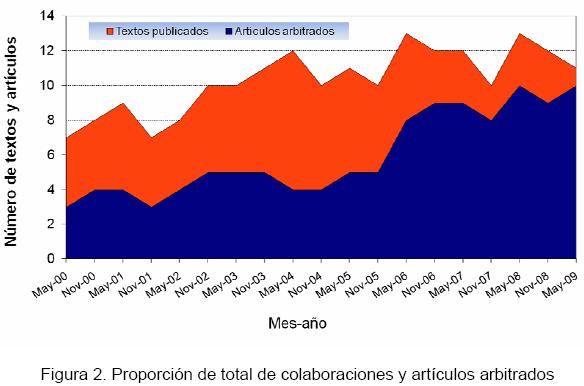 Por otra parte, la apertura en cuanto a la publicación de artículos también se ha reflejado en las colaboraciones que integran los ejemplares de la Revista a lo largo de estos 10 años. Al ver los índices de cada número, se observa que en los primeros la cantidad de artículos arbitrados era similar, y a veces hasta menor, que la de las colaboraciones no arbitradas (ver Figura 2). Esta proporción también se ha modificado durante los 10 años, al grado de que en 2007 se tomó la decisión de dar prioridad a la publicación de artículos arbitrados.