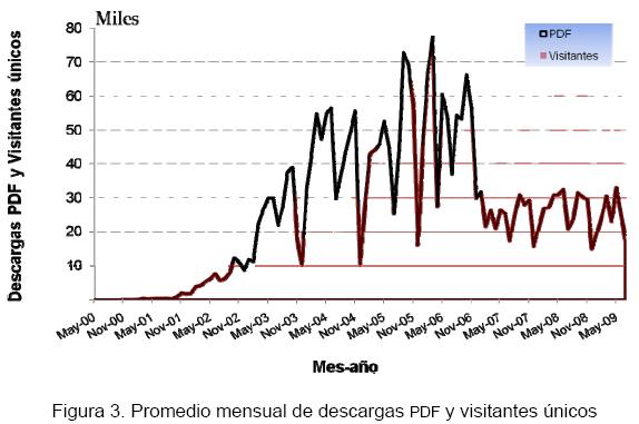 La estadística de descargas de archivos PDF da una subestimación del interés de los usuarios por los artículos publicados.4 Aún así, en los 10 años de la REDIE se registran más de 2'860,000 descargas de archivos PDF, con un promedio en los últimos cinco años de 35,771 mensuales (ver Figura 3).
