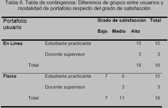En la Tabla II se presenta un análisis descriptivo del grado de satisfacción expresado por los usuarios, tanto estudiantes practicantes como docentes supervisores, respecto de la modalidad de portafolio en línea y físico.