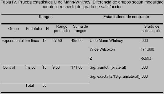 Para el análisis inferencial de la H2 , que expresa diferencia de grupos entre los usuarios del portafolio en línea y el portafolio físico respecto del grado de satisfacción, se aplicó la prueba estadística U de MannWhitney (ver Tabla IV).