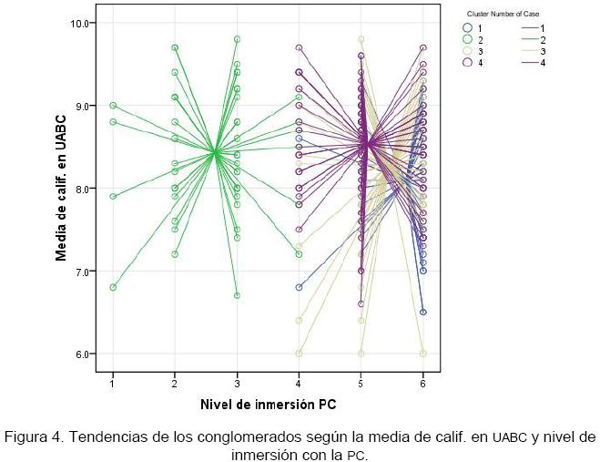 A partir de las variables de corte académico y de las destacadas por el análisis CHAID (nivel de inmersión en pe y Web) y escolaridad de los padres, se aplicó un análisis de conglomerados kmedias. Los resultados mostraron la importancia de las variables de corte tecnológico en la construcción de los conglomerados. Así, se muestra que una mayor calificación en universidad se asocia con una mayor calificación en bachillerato. De los cuatro conglomerados obtenidos, destacan el 1 y 4. Por un lado, el conglomerado 4, con mayor media de calificaciones en universidad, presenta un nivel moderado de inmersión computacional y bajo nivel de inmersión en la Web. Sin embargo el conglomerado 1, con la menor media de calificaciones en universidad, tuvo los mayores niveles de inmersión computacional y de la Web. Lo anterior sugiere la importancia de orientar el uso de los recursos computacionales y de Internet hacia un propósito mayormente educativo (Organista, Lavigne y McAnallySalas, 2008).