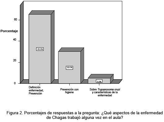 Al pedir a los docentes que asignaran importancia a esta enfermedad (mucha, media, poca), la mayoría (80%) le asignó mucha importancia, el 20% restante la consideró una enfermedad de poca importancia, aclarando que sabían muy poco sobre esta problemática de salud como para asignarle relevancia. Algunos comentarios al respecto fueron: "Me creía que esta enfermedad solo estaba limitada al área rural...", "esta enfermedad ya no es un problema como antes", "ya no se escucha sobre esta enfermedad y en los libros ya no está".