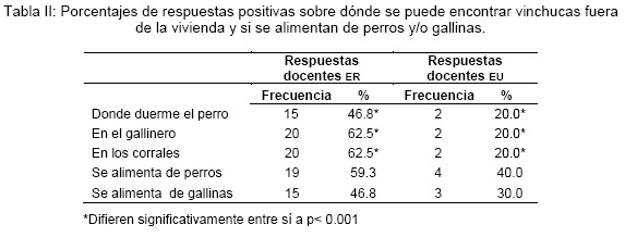 Teniendo en cuenta que una de las problemáticas actuales en el área rural tiene que ver con la presencia de vinchucas en el peridomicilio y el rol que cumplen los animales domésticos en mantener poblaciones de vinchucas, se preguntó: ¿Dónde puedo encontrar vinchucas fuera de la vivienda? y, además de las personas, ¿puede la vinchuca alimentarse de otro animal? Estas preguntas no fueron respondidas por un alto porcentaje (85%) de los docentes de EU, por ello los análisis se realizaron considerando solamente a los docentes que respondieron a estas preguntas (docentes ER= 29 y docentes EU = 10). Los sitios donde se pueden encontrar vinchucas fuera de la vivienda (donde duerme el perro, en el gallinero, en los corrales) fueron reconocidos en mayor porcentaje por los docentes de ER. Por otra parte no hubo diferencias entre docentes de ER y EU en las respuestas que señalaron como posible fuente de alimento a perros y gallinas (ver tabla II).