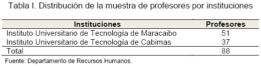 La población del estudio estuvo constituida por un conjunto de 746 sujetos de investigación integrada por 2 directores, 2 subdirectores académicos, 2 subdirectores administrativos y 740 profesores. Ahora bien, tomando en cuenta que la población que representa el estrato poblacional de directores, subdirectores administrativos y académicos, está conformada por escasas unidades de investigación, éstas fueron asumidas como muestra en su totalidad recurriendo a un censo. Para el caso del estrato poblacional profesores, se recurrió a su determinación la formula propuesta por Sierra (2001) para poblaciones finitas, quedando definida como n=88. Dentro de las características particulares de la muestra se tomaron profesores ordinarios a tiempo completo y con categoría de asociado. Para la determinación de la muestra en las diferentes instituciones se aplicó la foórmula de Shiffer, que arrojó los siguientes resultados (ver Tabla I):