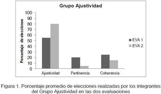 En el caso del grupo Ajustividad, durante la evaluación 1, los integrantes eligieron en promedio el 55% de los ejercicios cuyas opciones de respuesta estaban estructuradas con base en el criterio de Ajustividad. Mientras que en la evaluación 2 eligieron el 80% de las opciones que se correspondían con Ajustividad, presentando un aumento del 25% en la elección de opciones de respuestas estructuradas con dicho criterio después del entrenamiento. Es decir, en este grupo hubo una correspondencia entre el tipo de entrenamiento recibido y el tipo de opciones elegidas en la segunda evaluación. Mientras que en las opciones elegidas con base en los otros criterios disminuyeron en ambos tipos de opciones, en el caso de opciones con base en el criterio de Pertinencia, los integrantes de este grupo pasaron de 20% en la evaluación 1 a 5% en la evaluación 2, mientras que en las opciones elegidas con base en el criterio de Coherencia pasaron de 25% en la evaluación 1 a 15% en la Evaluación 2 (ver Figura 1).
