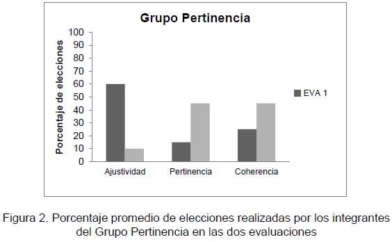 En el grupo Pertinencia, en la primera evaluación los integrantes eligieron en promedio un 15% de las opciones de respuestas estructuradas con base en el criterio de Pertinencia y en la evaluación 2 eligieron, en promedio, el 45% de los ejercicios, presentando un aumento del 30% en la elección de respuestas estructuradas bajo el criterio de Pertinencia después del entrenamiento. Se observó también un aumento en las opciones elegidas con base en el criterio de Coherencia, al pasar de 25% en la evaluación 1 a 45% en la evaluación 2, aunque este aumento fue menor que en las opciones construidas con base en el criterio de Pertinencia. Es importante señalar que este grupo en la evaluación 1 eligió en un 60% promedio de los ejercicios la respuesta estructurada bajo el criterio de Ajustividad, pero después del entrenamiento sólo la eligieron en el 10% de los ejercicios. En suma, en este grupo el entrenamiento recibido modificó el tipo de opciones que eligieron en la segunda evaluación, pasando de elegir opciones de Ajustividad a opciones de Pertinencia y Coherencia (ver Figura 2).