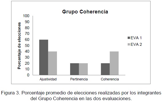 Con respecto al Grupo Coherencia, los miembros de este grupo en promedio eligieron en la evaluación 1 el 60% de los ejercicios estructurados con base en el criterio de Ajustividad, pero después del entrenamiento sólo la eligieron, en promedio, en el 40% de los ejercicios. Mientras que en el caso de las opciones de respuesta construidas con base en el criterio de Pertinencia no hubo cambios, ya que en ambas evaluaciones los integrantes de este grupo eligieron, en promedio, un 20% de los ejercicios. En la elección de opciones de respuestas estructuradas con base en el criterio de Coherencia se observó que en la evaluación 1 los integrantes del grupo eligieron, en promedio, un 20% de los ejercicios con opciones estructuradas con base en este criterio y en la evaluación 2 eligieron, en promedio, el 40% de los ejercicios, observándose un aumento del 20% después del entrenamiento, justo en esas opciones (ver Figura 3).