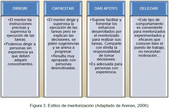 Además, para la supervisión del avance hay que atender a tres pilares básicos de la relación de mentoría: organización, desarrollo de una buena comunicación y estar abierto al dialogo, y mantener el nivel de motivación durante el proceso. En la Figura 3 se especifican cuatro patrones posibles de comportamiento (Arenas, 2006).