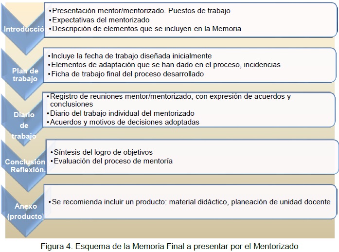 En cuarto y último lugar, presentamos la estructura de la Memoria Final, que tiene como objetivo reflejar en un documento la experiencia de la mentorización y del desarrollo profesional. Ha de englobar un análisis y valoración de la adquisición de competencias, conocimientos, habilidades y una valoración de la experiencia de aprendizaje y de formación profesional. Los apartados más relevantes de dicha memoria se muestran en la Figura 4.