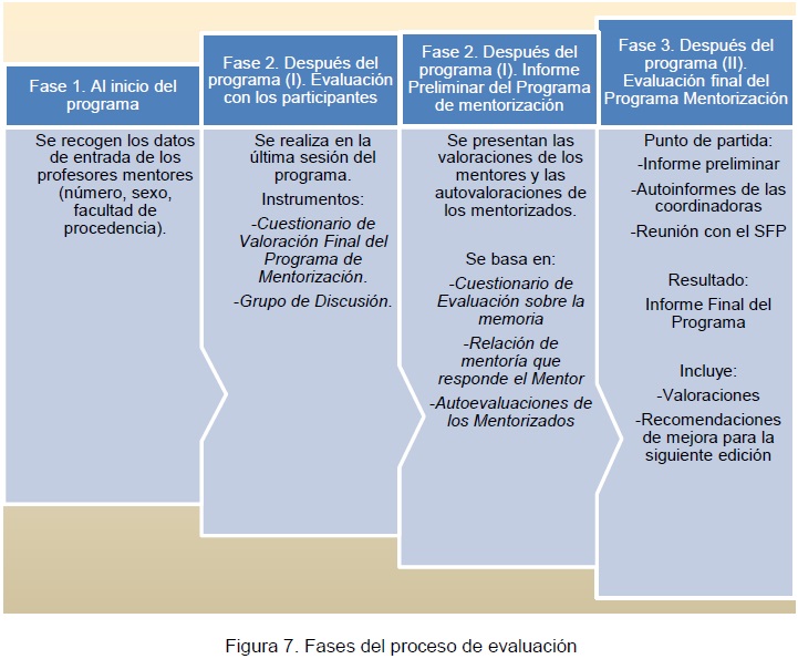 En cuanto a los momentos de recogida y análisis de la información se concreta en tres momentos o fases (ver Figura 7). Este sistema de evaluación permite contar con las valoraciones de las diferentes audiencias e integrarlas en una síntesis final que nos permita una mejor comprensión del Programa y su desarrollo. A partir de estas consideraciones, se mejora el programa para ediciones sucesivas. Asimismo, la revisión del propio proceso de evaluación, por el análisis de su implementación y por las recomendaciones extraídas de los mentores, ofrece un sistema integrado de seguimiento y evaluación, que puede ser integrado en la dinámica habitual del programa.