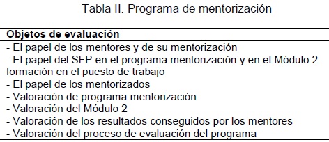 Respecto al SFP no contamos con ningún instrumento específico para recoger información, pero se programa una reunión inicial y una final, para poder comentar cambios, mejoras, derivadas de las diferentes informaciones de las otras fuentes. De este modo, el SFP desempeña un doble rol respecto a la evaluación del programa de mentorización: a) está implicado en la misma, como fuente de información, y b) como responsable final del Programa, recibirá el Informe Final, para tomar decisiones al respecto, permaneciendo en este momento externo al proceso de evaluación.