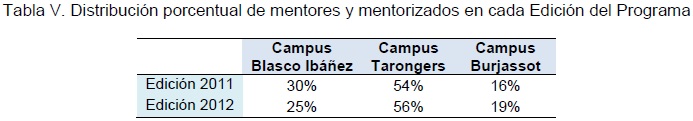 En cuanto a la Facultad/Departamento de pertenencia es importante apuntar que tanto mentores como mentorizados pertenecen a los tres campus de la Universitat de València y tienen una distribución similar, ya que mentor y mentorizado pertenecen a la misma área y departamento en casi todos los casos. Así, se observa la siguiente distribución por campus: sobre un 25-30% pertenecen al campus Blasco Ibáñez, sobre un 55% al campus de Tarongers y sobre un 16-19% al campus de Burjassot. Hay que tener en cuenta que hay un número mayor del campus de Tarongers, ya que se concentran mayor número de profesorado en dicho campus (ver tabla V).