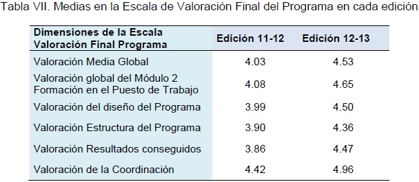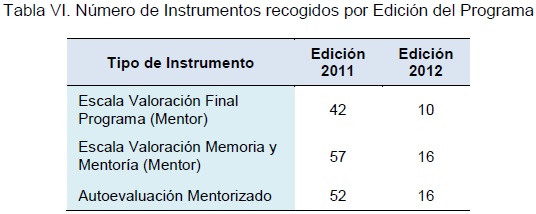Respecto a la información recogida se puede observar en la Tabla VI el número total de cuestionarios recogidos en función del tipo de instrumento y de la muestra a la que iba dirigido. A continuación analizaremos los resultados obtenidos en función de la información extraída en cada instrumento. En cuanto a la opinión de los mentores al contestar a la Escala Valoración Final Programa se observa que en ambas ediciones la valoración global del programa es muy positiva, ya que supera el punto 4 de la escala.