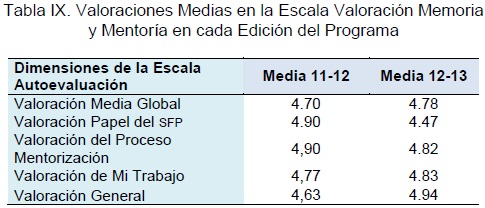Respecto a la Autoevaluación que lleva a cabo el mentorizado, podemos destacar que en ambas ediciones la media global de los ítems es muy positiva, ya que se supera el 4.5 de la escala (ver Tabla IX). Esto quiere decir que tanto en la edición del 2011 como en la del 2012 los mentorizados han valorado muy satisfactoriamente el papel del SFP en la organización de este módulo, el proceso de mentorización llevado a cabo por el mentor, su propio trabajo realizado y comentan que recomendarían el módulo para otras ediciones y que les servirá para mejorar su trabajo.