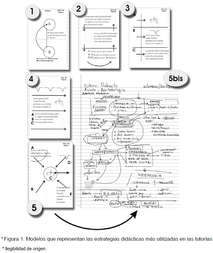 En la figura 1 las páginas modelo se presentan mediante un énfasis gráfico que no resulta tan obvia en las notas de la tutoría, algunas de las relaciones, procesos, y secuencias son producidas por la interacción de la estructura gráfica y la narrativa del tutor. Los modelos deben ser considerados como estrategias generales de organización del discurso tutoral, los elementos gráficos, como los círculos y esquemas, indican que pueden utilizarse distintas técnicas de representación como mapas conceptuales, diagramas uve, redes semánticas, cuadros, entre otros. Las flechas se utilizan para ejemplificar la dinámica narrativa, por ejemplo la secuencia en la que se aborda un tema, siguiendo la dirección de las flechas, y también el "regreso" a un momento de la tutoría, tal es el caso de las fechas que "regresan" o "cruzan" a otros elementos de la página.