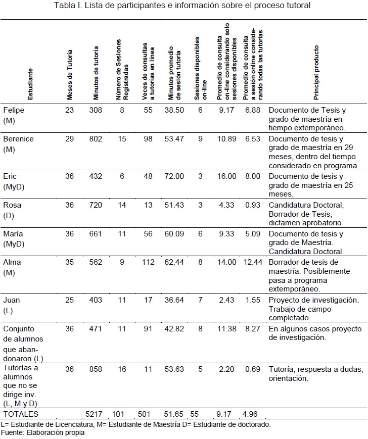La primera sesión no es grabada, en ella se explica la dinámica de la tutoría, la duración de las sesiones es de 20 a 50 minutos, en la Tabla I puede verse el promedio de duración de las sesiones. Los principios básicos que se establecen son: a) Las reuniones para tutoría pueden ser solicitadas por el estudiante en cualquier momento mediante correo electrónico; b) La decisión de aprender sólo puede corresponder al alumno, la responsabilidad del tutor es ayudar a brindar condiciones y ayudas para el aprendizaje; c) La dinámica y frecuencia de las tutorías es resultado del trabajo en la investigación, por ello no existe un calendario, en la medida que se requiera, se solicitan una vez realizadas las tareas o actividades acordadas en la última sesión; d) Se explica al estudiante que forma parte de una comunidad de profesores y estudiantes y que en algunos casos hay actividades colaborativas o grupales, por ejemplo en cursos y seminarios que forman parte del programa de formación.