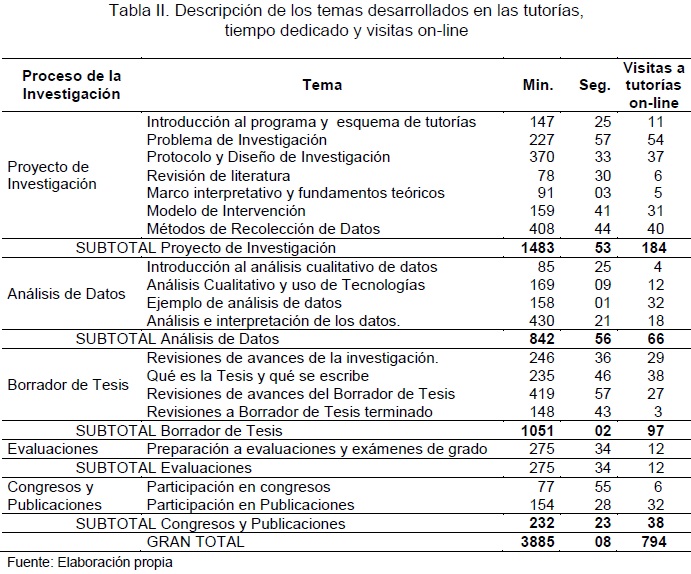 La Tabla II agrupa los temas de las tutorías en procesos de la investigación, lo que permite observar más ampliamente la distribución del tiempo dedicado a las tutorías y las visitas on-line que hacen los estudiantes.