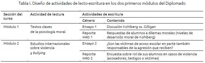 El diseño de los dos primeros módulos del diplomado cumplía, dentro de ese plan general, una función estratégica: desarrollar habilidades de lectura y escritura académica bajo el supuesto de que el conocimiento del campo de la psicología moral, así como el dominio de géneros académicos estratégicos (ensayo argumentativo y reporte de investigación IMRD) ofrecerían a los maestros una formación útil para abordar esos problemas de violencia escolar (Tabla I).