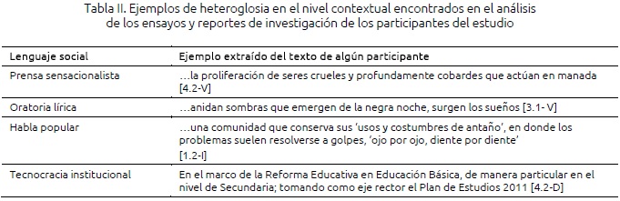 En la Tabla II se exponen algunos ejemplos más de la heterogeneidad de lenguajes sociales (Gee, 1999) que se amalgaman en su discurso escrito. A nuestro juicio, es claro que esa diversidad no puede interpretarse como riqueza polifónica o estilística, pues no están al servicio de una visión conjunta congruente. Reina la anarquía, no la democracia plural.