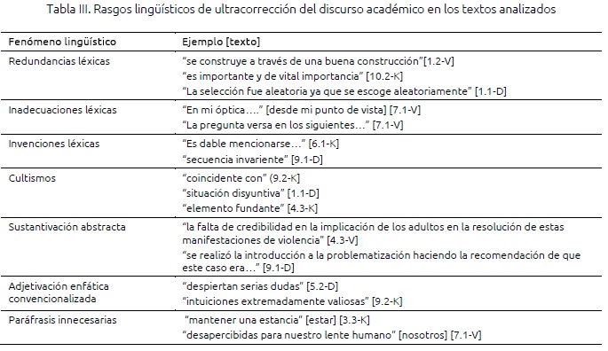 En general, los textos tienen una ortografía aceptable aunque son frecuentes los problemas de puntuación. Pero el fenómeno lingüístico más importante es la reproducción estereotipada y desnaturalizada de los rasgos que los participantes asocian al discurso formal de la academia. En la tabla III se presentan ejemplos de esos casos de ultracorrección que parecen derivarse de una comprensión errónea del discurso académico: se prefiere escribir con más palabras que con menos y se abusa del uso técnico del lenguaje en lugar de optar por soluciones más comunes.