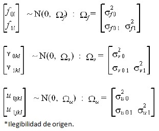 Donde resp1jkl y resp2jkl refieren a los desempeños en Matemática y Lectura, respectivamente, del alumno j, en la escuela k del país l; cons.mat y cons.lect son constante=1 para cada puntaje de Matemática y Lectura, respectivamente; ß0jkl y ß1jkl son parámetros asociados a cons.mat y cons.lect, respectivamente, compuestos por los logros promedios estimados (parte fija) en matemática (ß0) y lectura (ß1), y por los residuos en los niveles país, escuela y alumno en Matemática (ƒ0l,V0kl y µ0jkl), y Lectura (ƒ1l, V1kl y µ1jkl), cuyas varianzas respectivas en Matemática (σ2ƒ1, σ2v1 y σ2µ1) y Lectura (σ2ƒ0, σ2v0 y σ2µ0) son cantidades aleatorias, no correlacionadas, normalmente distribuidas, con media=0 y cuyas varianzas han de estimarse en la parte aleatoria del modelo, ajustando también la matriz de covarianza por Matemática y Lectura en los tres niveles. Formalmente:
