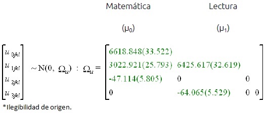 Donde el orden de los términos aleatorios es el intercepto de matemática (µ0) y de lectura (µ1), seguido por el término días en relación a Matemática (µ2) y a Lectura (µ3). Los términos (µ2) y (µ3), entonces, indican las variaciones de los interceptos -promedios de Matemática y Lectura, respectivamente-, según días. En este modelo se omiten las varianzas del efecto de días en ambas pruebas y los términos de covarianza correspondientes.