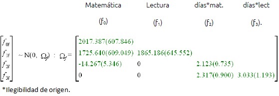Donde el orden de los términos aleatorios es el intercepto de Matemática (ƒ0) y de Lectura (ƒ1), seguido por las diferencias por días para Matemática (ƒ2) y Lectura (ƒ3).