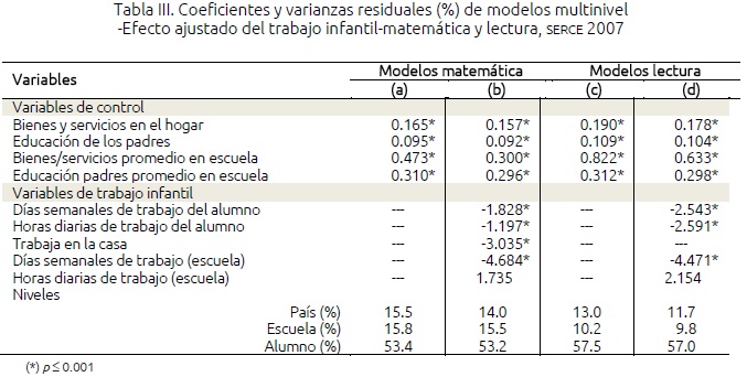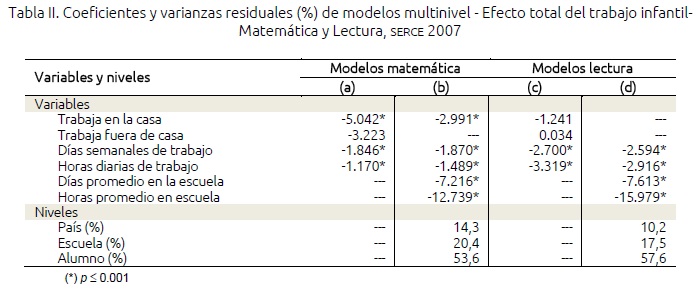 Las diferencias entre países respecto de los desempeños promedio en ambas asignaturas, se asocian aún más pronunciadamente con la incidencia del trabajo infantil. En este nivel, las varianzas residuales de matemática y lectura descienden a 14,3% y a 10,2%, respectivamente, implicando decrecimientos relativos respecto del modelo vacío superiores a 34% en matemática y 44% en lectura.