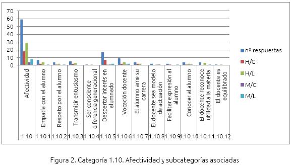 La subcategoría 1.10.1. Empatia con el alumno, es valorada también por 6 hombres (6% de los varones), 4 de Letras (Pamplona, Sevilla, Santiago y Valencia), y 2 de Ciencias, (Santiago y Valencia), y en esta ocasión por sólo 1 mujer de Letras, de Sevilla, que representa el 5% de las docentes. En cuanto a especialidades sigue la tendencia anterior. Algunas de las respuestas fueron "el alumno vea en ti a alguien en quien poder confiar, es fundamental conectar con el alumno". Con 5 respuestas la categoría 1.10.3. Transmitir entusiasmo, es valorada por 3 hombres de Letras (Pamplona, Sevilla y Santiago), y 2 de Ciencias, (Sevilla y Santiago), lo que representa el 5% de los docentes y en esta ocasión no se contabiliza ninguna mujer. Algunas de las respuestas fueron "la docencia tiene que ser estimuladora, hay que transmitir entusiasmo por la materia que enseñas, que el alumno disfrute aprendiendo".